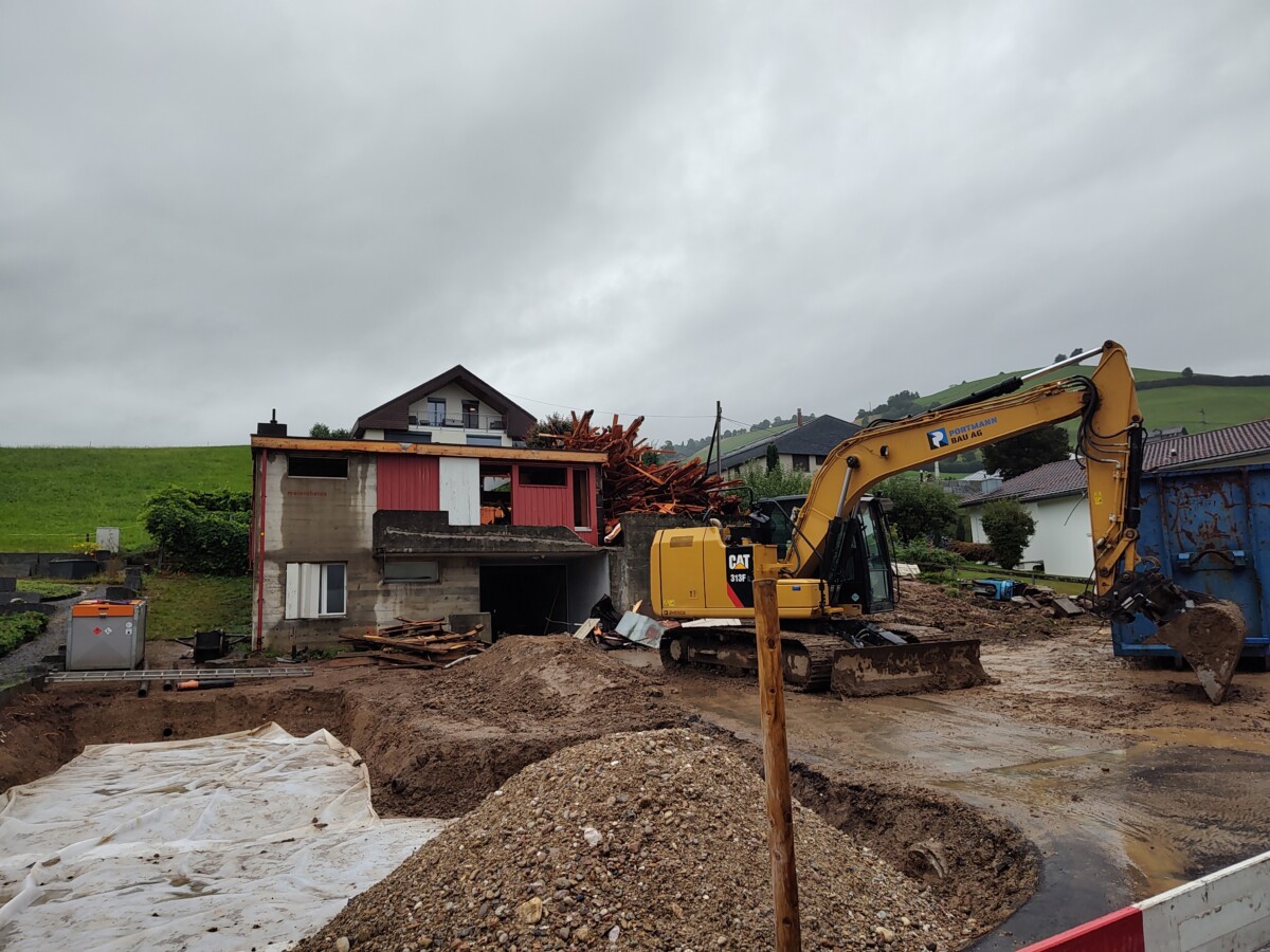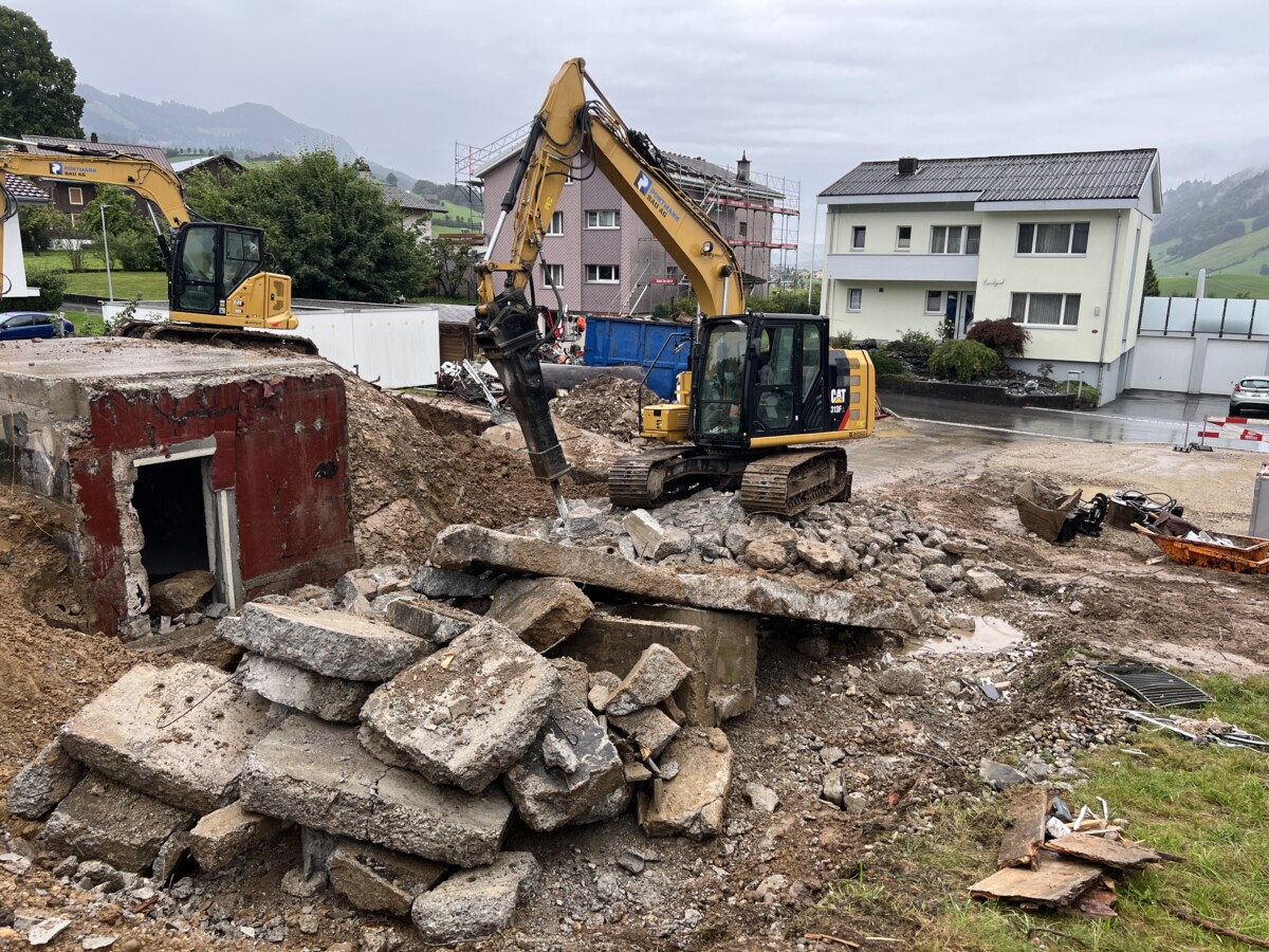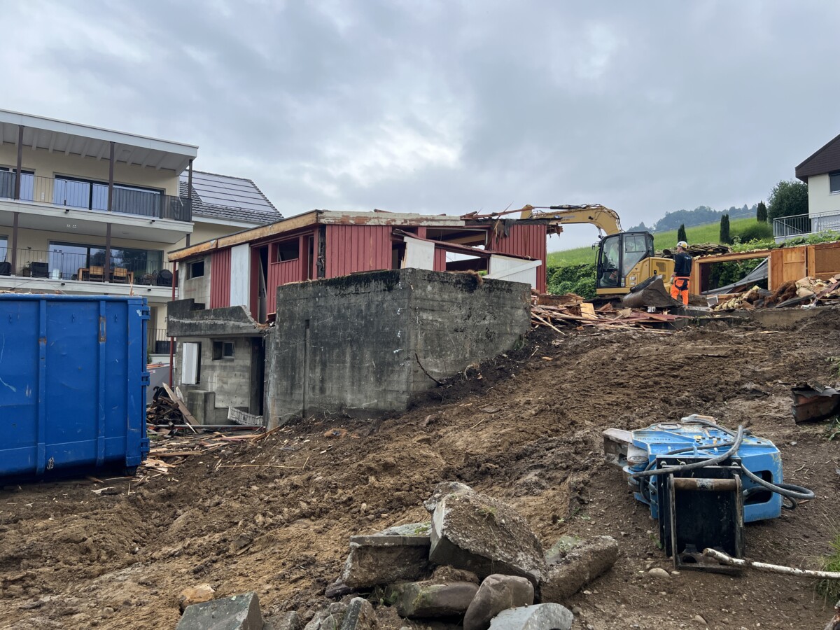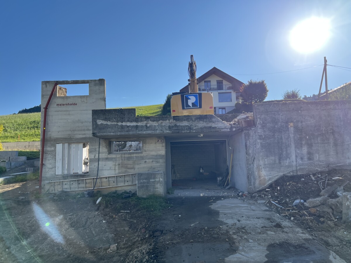 Nach erfolgreicher Eingabe für den Ersatzneubau eines grosszügigen Einfamilienhauses starteten im August die Rückbauarbeiten. Das bestehende Wohnhaus aus den späten 1950er Jahren in der Meiershalde wurde bis auf den Bunker zurückgebaut. Der bestehende Bunker wurde in die Planung integriert und dient im Neubau künftig als Kellerraum.