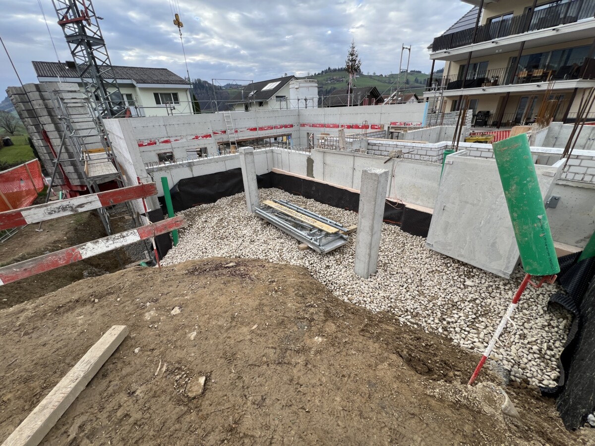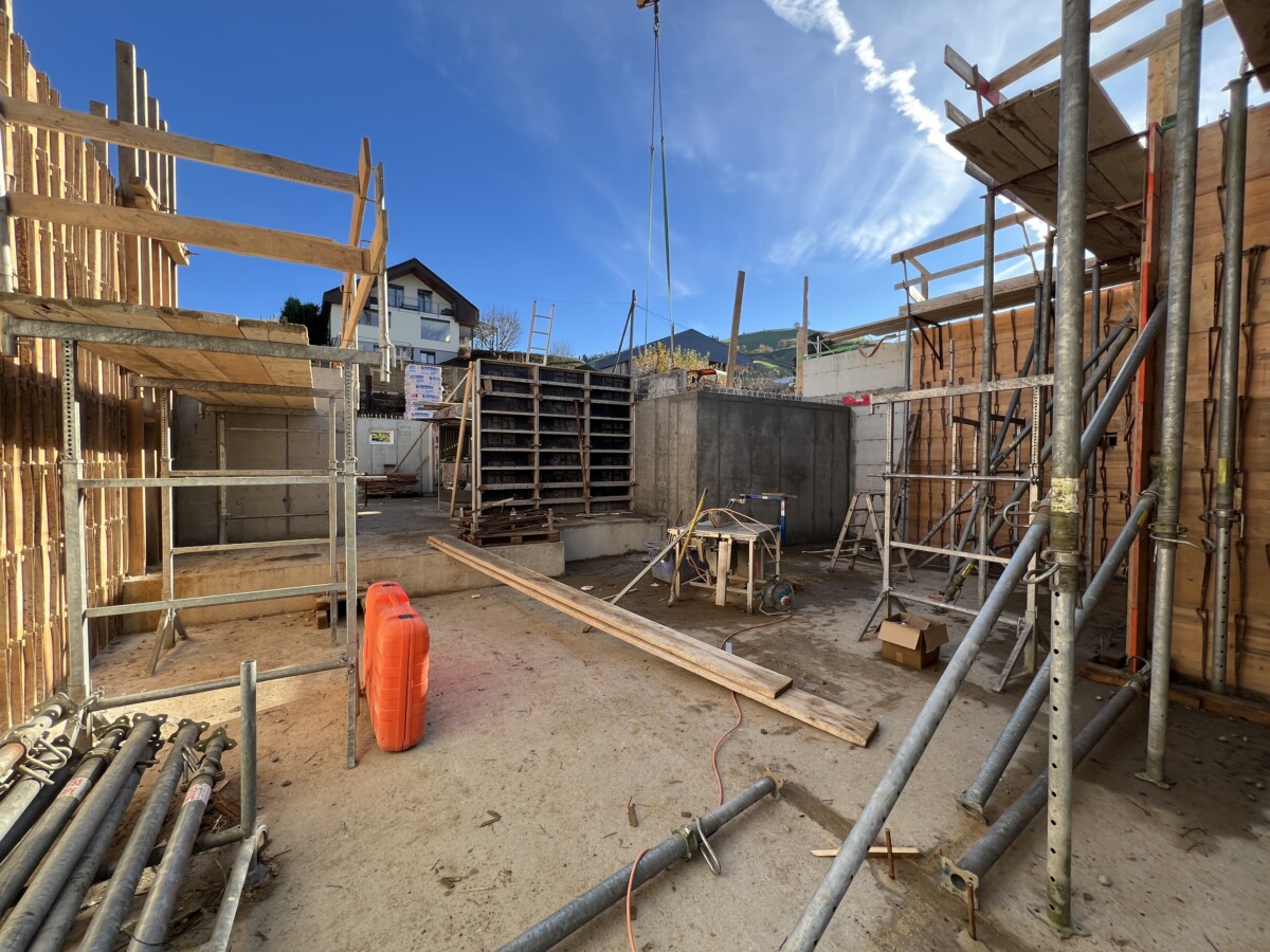 Nach erfol­gre­ich­er Eingabe für den Ersatzneubau eines grosszügi­gen Ein­fam­i­lien­haus­es starteten im August die Rück­bauar­beit­en. Das beste­hende Wohn­haus aus den späten 1950er Jahren in der Meier­shalde wurde bis auf den Bunker zurück­ge­baut. Der beste­hende Bunker wurde in die Pla­nung inte­gri­ert und dient im Neubau kün­ftig als Kellerraum.